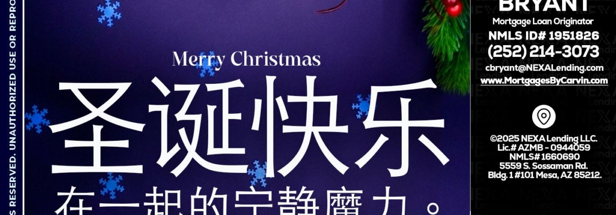 圣诞快乐 在一起的宁静魔力。 - Carvin Bryant -Mortgage Loan OriginatorHi, my name is Carvin Bryant. I’m a Loan Officer with NEXA Lending LLC., offering personalized mortgage solutions, fast customized quotes, great rates and service with integrity.