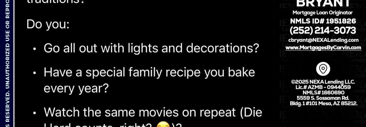 I love christmas - Carvin Bryant -Mortgage Loan OriginatorHi, my name is Carvin Bryant. I’m a Loan Officer with NEXA Lending LLC., offering personalized mortgage solutions, fast customized quotes, great rates and service with integrity.
