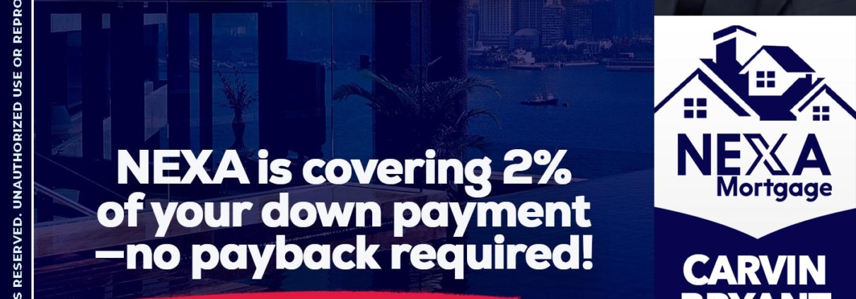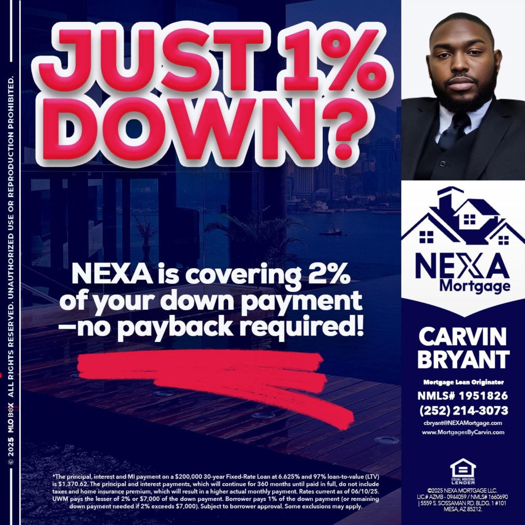 JUST 1% DOWN - Carvin Bryant -Mortgage Loan OriginatorHi, my name is Carvin Bryant. I’m a Loan Officer with NEXA Mortgage LLC., offering personalized mortgage solutions, fast customized quotes, great rates and service with integrity.