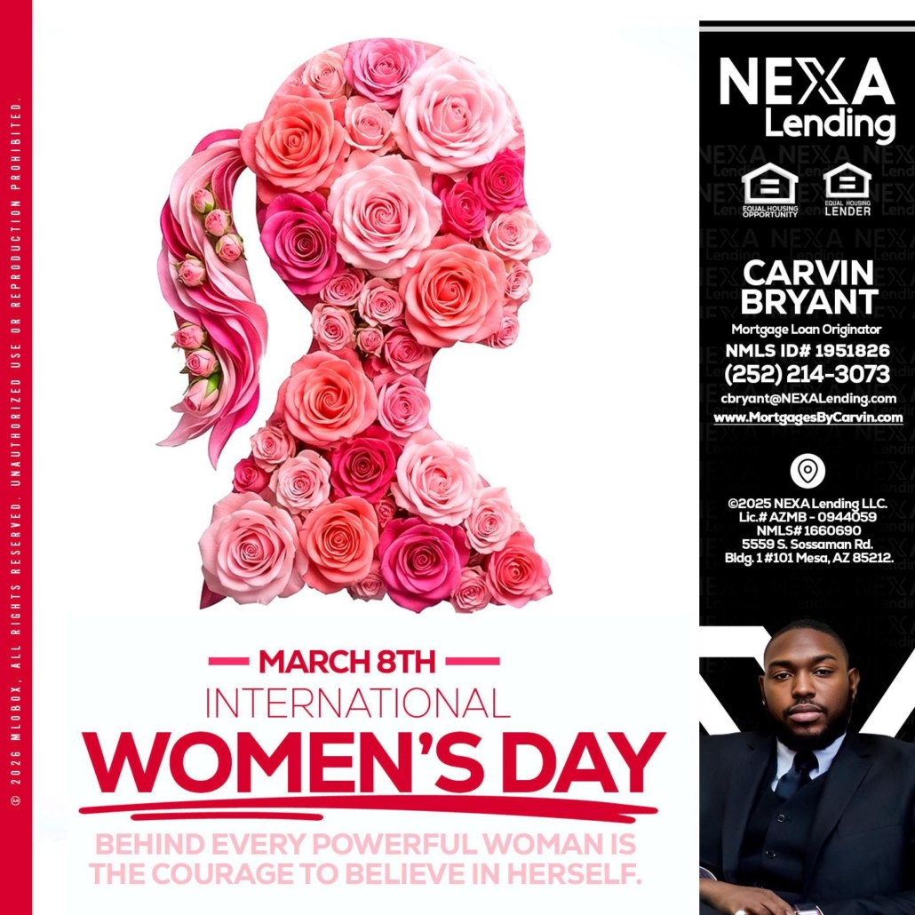 MARCH 8TH - Carvin Bryant -Mortgage Loan OriginatorHi, my name is Carvin Bryant. I’m a Loan Officer with NEXA Lending LLC., offering personalized mortgage solutions, fast customized quotes, great rates and service with integrity.