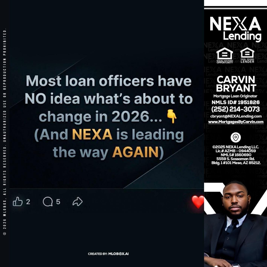 most loan officers - Carvin Bryant -Mortgage Loan OriginatorHi, my name is Carvin Bryant. I’m a Loan Officer with NEXA Lending LLC., offering personalized mortgage solutions, fast customized quotes, great rates and service with integrity.