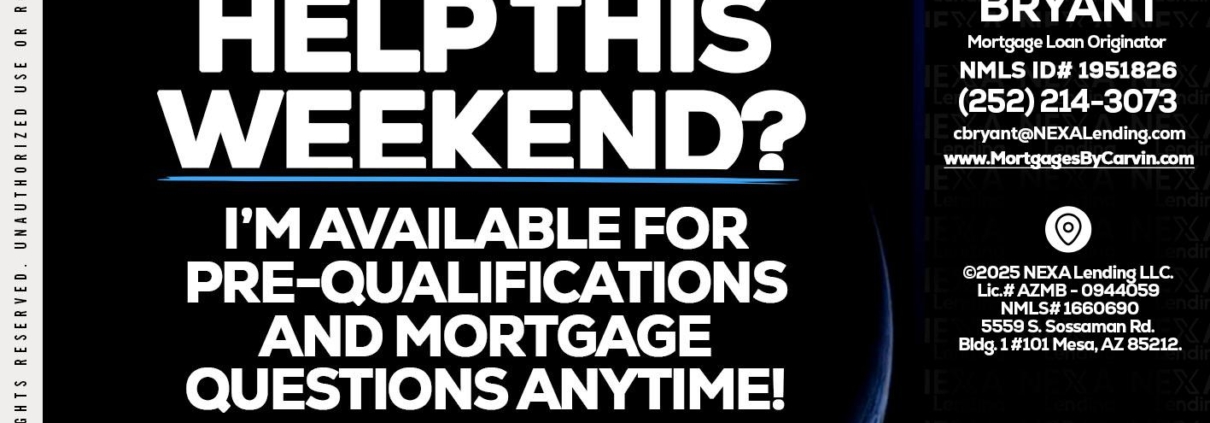 REAL ESTATE AGENTS - Carvin Bryant -Mortgage Loan OriginatorHi, my name is Carvin Bryant. I’m a Loan Officer with NEXA Lending LLC., offering personalized mortgage solutions, fast customized quotes, great rates and service with integrity.