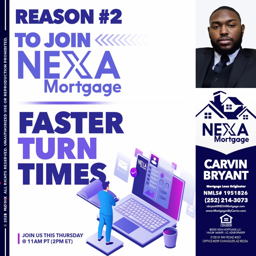 Hi, my name is Carvin Bryant. I’m a Loan Officer with NEXA Mortgage LLC., offering personalized mortgage solutions, fast customized quotes, great rates and service with integrity.