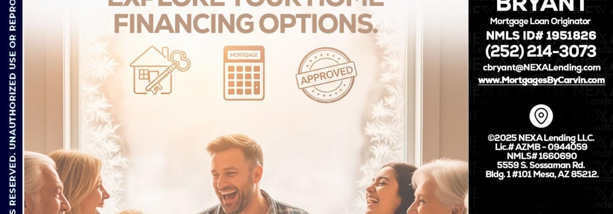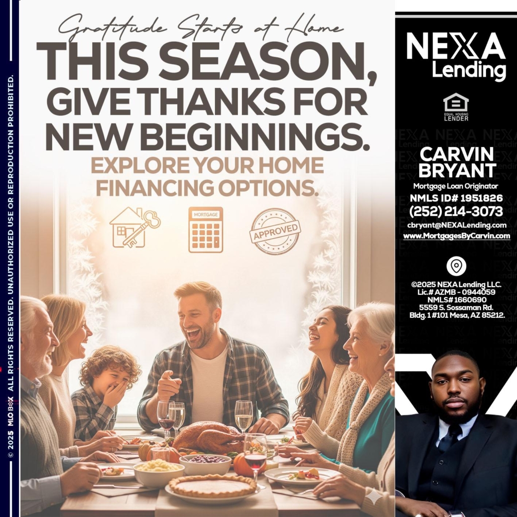 THIS SEASON - Carvin Bryant -Mortgage Loan OriginatorHi, my name is Carvin Bryant. I’m a Loan Officer with NEXA Mortgage LLC., offering personalized mortgage solutions, fast customized quotes, great rates and service with integrity.